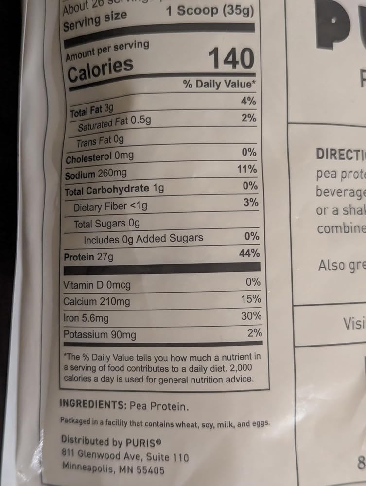 I picked this up as a simple, plant based option for days when I don’t want whey, and it’s been exactly that. no fuss, no weird additives, just pea protein. The label is short and to the point, which I appreciate. I wanted pure protein without the parade of artificial colors and fillers, and that’s what this is.I’ve been mixing it with regular milk and chocolate milk, and it blends surprisingly well for a pea protein. A few shakes in a bottle and it’s smooth enough to sip without chasing clumps. The taste is mild and leans neutral, so it doesn’t fight with whatever you mix it with chocolate milk actually makes it feel like a treat after a workout.One scoop clocks in at 27 grams of protein, which is solid for hitting daily targets without stacking multiple servings. The 2 pound bag is a good value for the amount of protein you get, and it’s easy to work into more than just shakes I’ve tossed a scoop into oatmeal and pancake batter and it disappears right in.What sealed the five stars for me is the simplicity. I don’t need neon colors, sugar bombs, or a list of ingredients that reads like a lab sheet. This is clean, plant based protein that mixes well, sits fine on the stomach, and helps me hit my numbers. Exactly what I wanted.