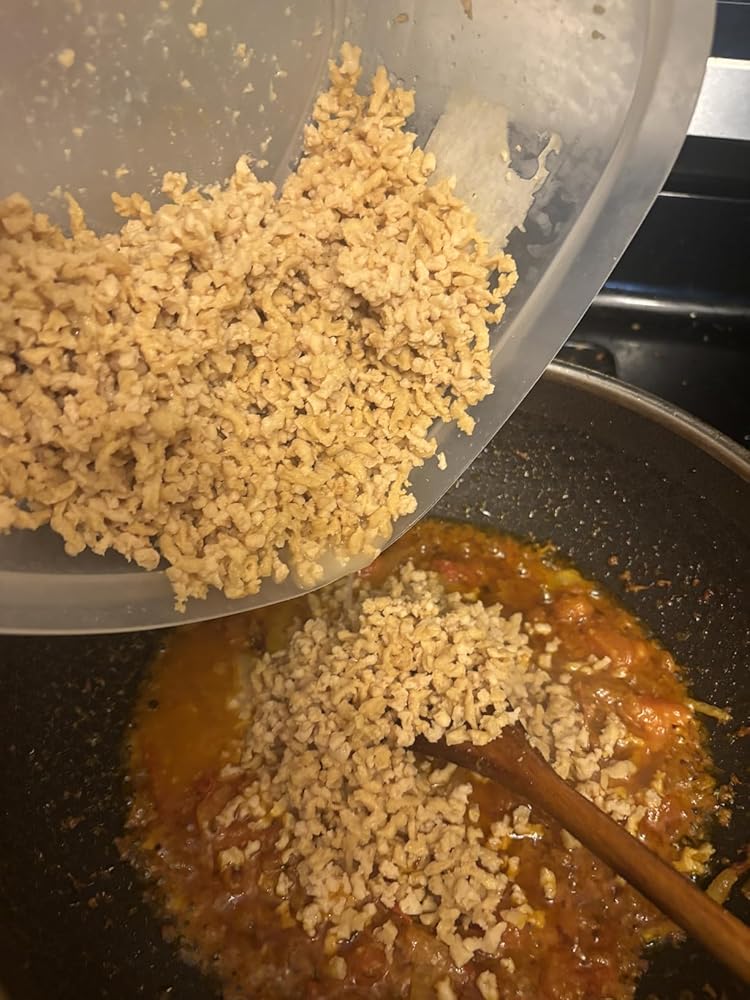 I have been looking for good “meat alternative” options ever since my husband started his vegan journey. I am so happy I found this one. It comes dehydrated so at first the quantity seems small, but just follow the instructions and see this product change like magic. The instructions say to add 1.5 cups of water to 2 cups of product. That’s exactly what I did. I made sure to stir it so the product and water mixed well. I let it sit (about 15-20 minutes) while I cooked up an onions and tomatoes base for my dish. The product more than doubled in size in this time. I used it to prepare a vegan “ground beef” and bell peppers dish. It cooked like ground beef normally would, except with a much shorter cooking time. The finished dish looked similar to the one I would make with ground beef. The aroma, flavor and texture were all there without the “meat” tasting strange or rubbery. The product absorbed the spices really well and the dish turned out looking and tasting delicious. Am I switching over to a vegan diet? No, but I will happily eat this alongside my husband. If you are looking to add a “meat alternative” to your vegan options, and are in need of a product that cooks up easily and tastes great, I highly recommend this.