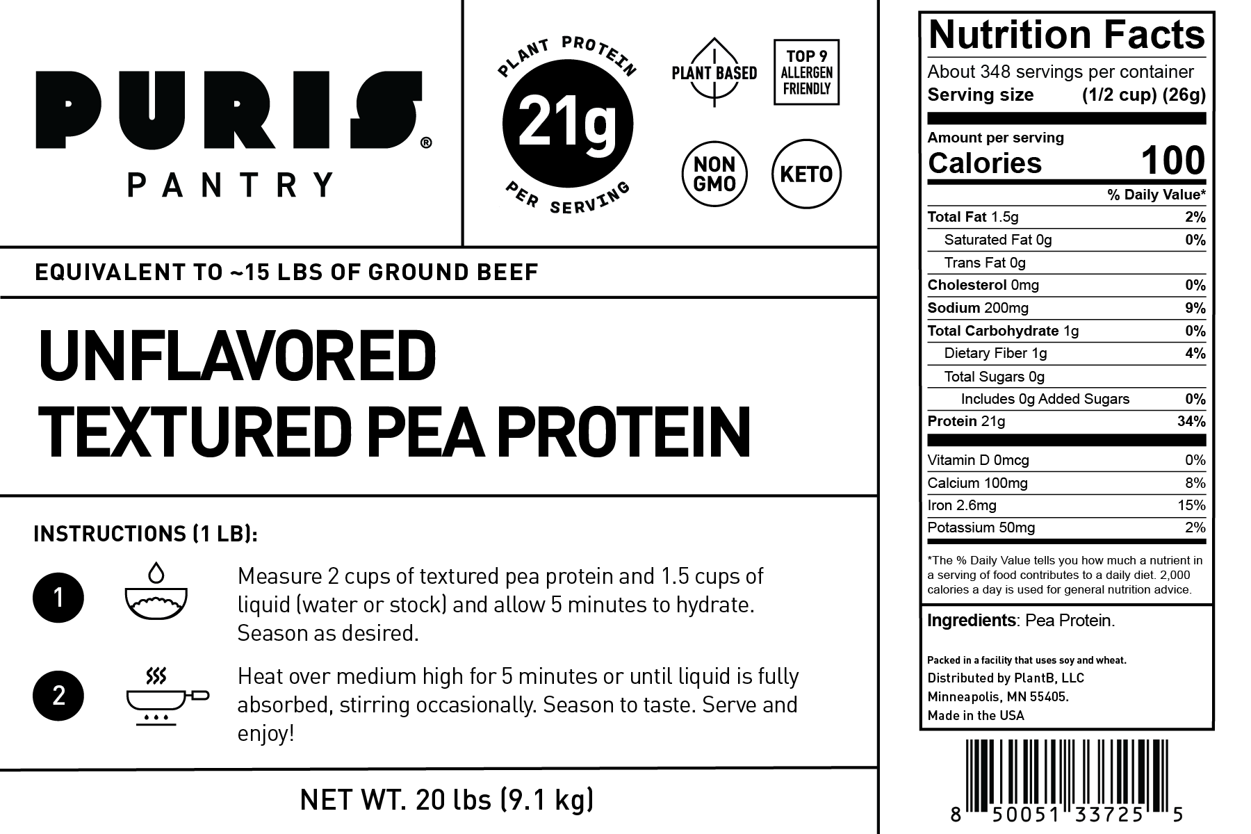 - VERSATILE & EASY TO USE: One pound of PURIS Textured Pea Protein is equivalent to approximately three pounds of ground meat. To use, simply hydrate in water or vegetable broth, season to your liking, and cook like normal. Use it in tacos, lasagna, soup, or anywhere else in place of ground meat!